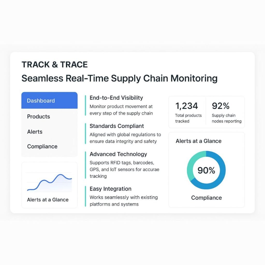 Monitor your products’ journey across the supply chain in compliance with the latest standards. With easy integration across multiple platforms and advanced technologies like RFID tags, barcodes, GPS, and IoT, our solution ensures unparalleled visibility, safety, and regulatory compliance.